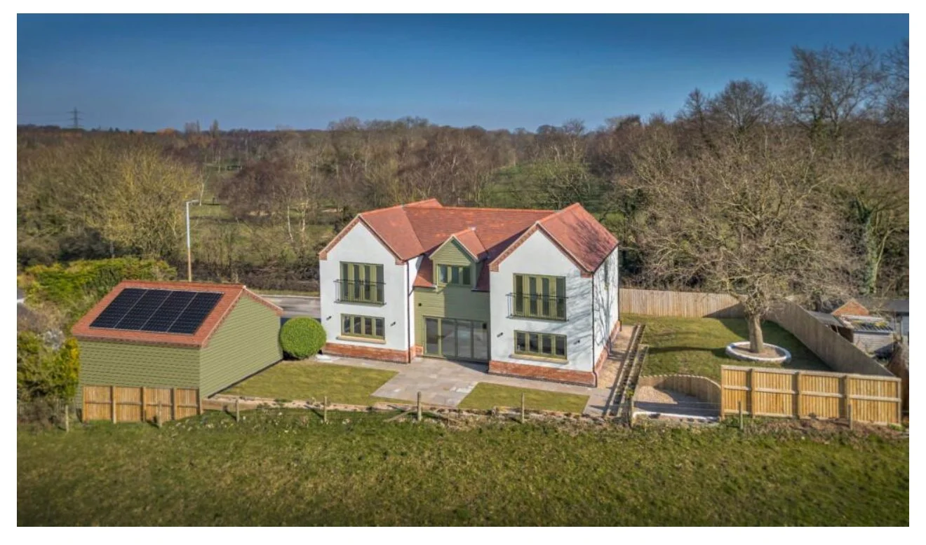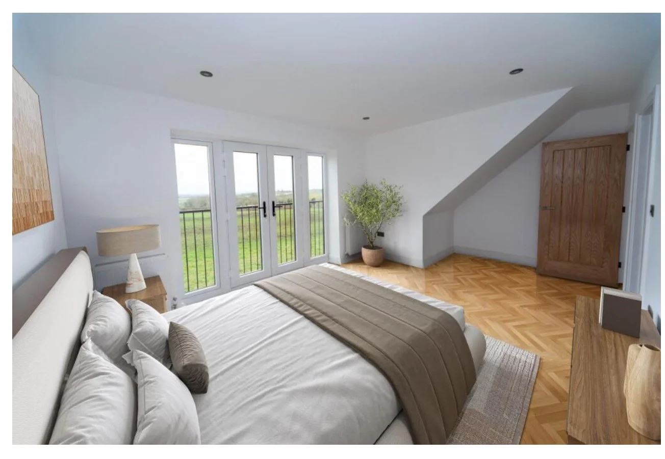A bespoke four-bedroom detached home crafted for comfort and elegance. Perched to offer gorgeous countryside and golf-course views, this energy-efficient design features underfloor heating, solar panels, and an air-source heat pump. The open-plan living-dining-kitchen is enhanced by bi-fold doors leading to a sunlit terrace, ideal for both family life and stylish entertaining. Upstairs, two ensuite bedrooms (each with a Juliet balcony and dressing area) ensure luxury and privacy.